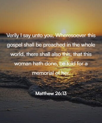 13 내가 진정으로 너희에게 말한다. 온 세상 어디서든지, 이 복음이 전파되는 곳에서는, 이 여자가 한 일도 전해져서, 그를 기억하게 될 것이다."